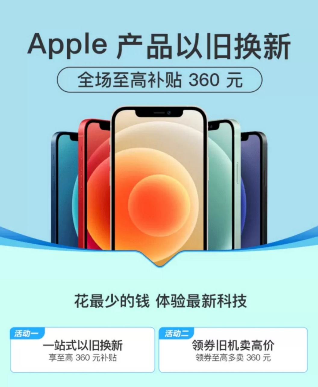 據了解,蘇寧易購推出蘋果以舊換新額外補貼服務,Apple產品以舊換新全場至高補貼360元。針對手機產品,以舊換新更是可以選擇“一站式換新”、“先送新后收舊”等服務,最快1小時上門回收。