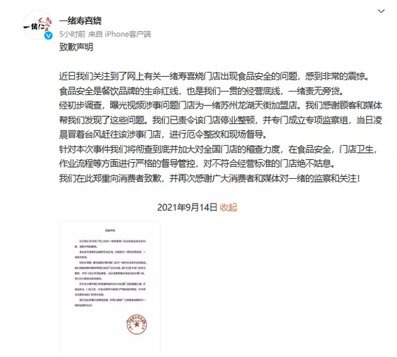 針對上述種種問題,9月14日一緒壽喜燒發布了致歉聲明,聲明中表示:對視頻中的食品安全問題感到非常震驚。經初步調查,涉事門店為蘇州龍湖天街加盟店,目前已責令該門店停業整頓,并成立專項檢查組,進行整改和現場督導。只是,對于該致歉聲明,網友似乎并不滿意,不僅公開表示壽喜燒毫無誠意,還痛斥壽喜燒應該直接倒閉。