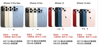 目前,iPhone 13 和 iPhone 13 Pro 等新品即已上架天貓Apple Store 官方旗艦店,并啟動預約,售價分別為5999元起、7999元起,新品上市期,即享受12期分期免息優惠。