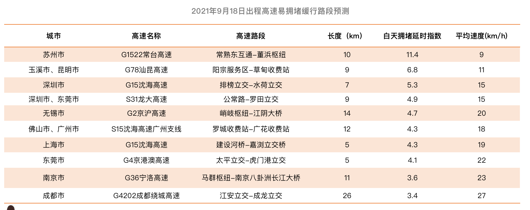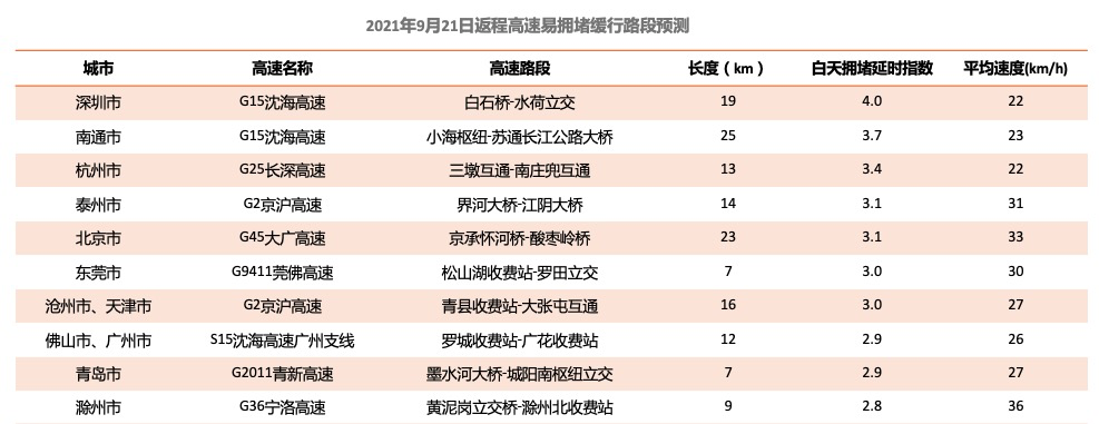 9月21日,十大返程高速易擁堵緩行路段中,G15沈海高速深圳段(白石橋-水荷立交)有19公里較緩行路段,平均速度約為22km/h,其次是G15沈海高速南通段(小海樞紐-蘇通長江公路大橋)以及G25長深高速杭州段(三墩互通-南莊兜互通)等。