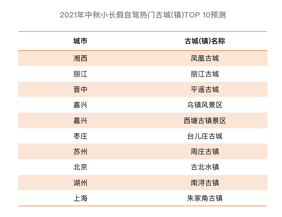 在2021中秋小長假熱門出行目的地方面,預計全國熱門旅游城市TOP10中南方城市占據八席,排名前三的分別是北京、上海和深圳。中秋時節,古鎮出游別有風情,2021年中秋期間,預計全國自駕熱門古城(鎮)TOP10中,湘西鳳凰古城排名第一,其次是麗江古城和晉中平遙古城。公安部交通管理局提醒群眾中秋自駕出行注意避堵,近期國內疫情零星散發,更要注意個人防護,出行佩戴口罩,保持安全距離。