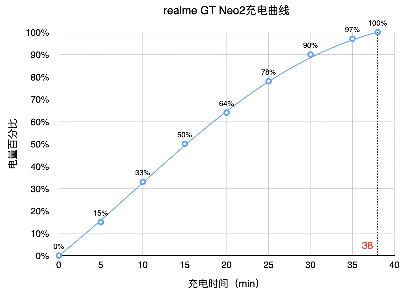真我GT Neo2搭載了5000mAh的超大電池,同時保留了65W的SuperDart閃充功能,實測采用原裝充電器為手機進行充電,15分鐘即可為手機充電50%,0-100%充電僅需38分鐘。