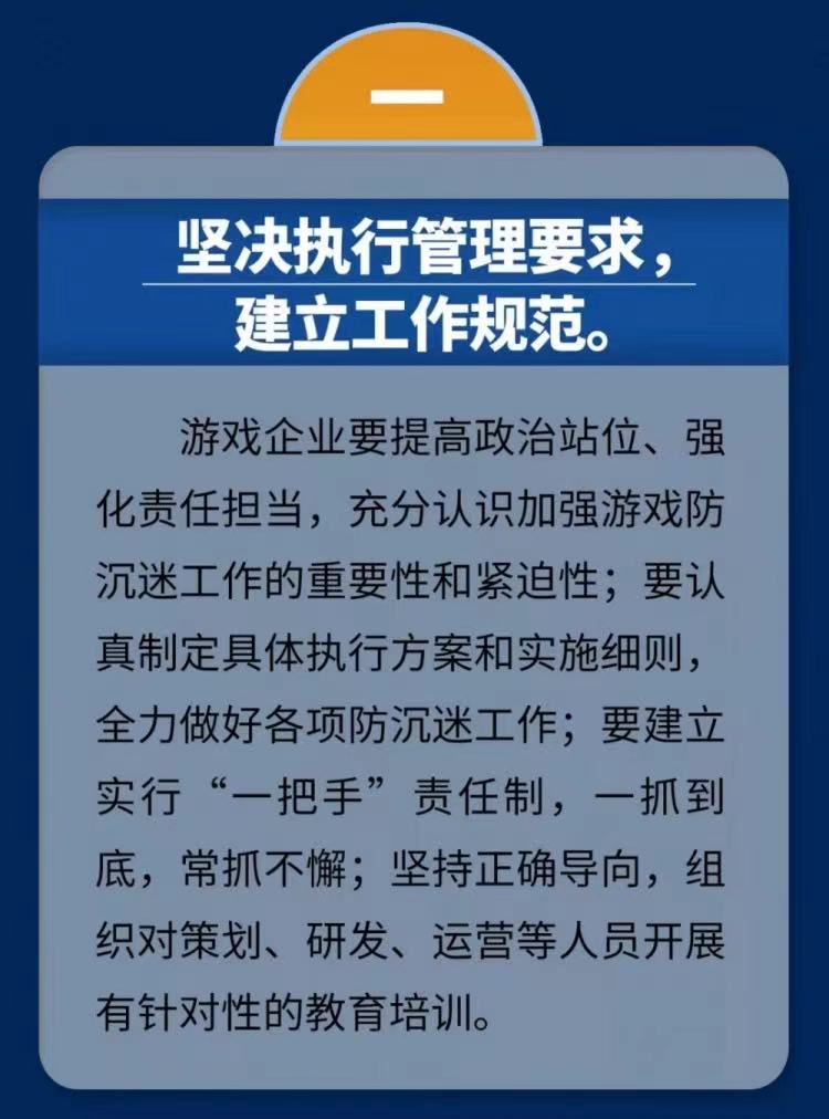 1、堅(jiān)決執(zhí)行管理要求,建立工作規(guī)范。游戲企業(yè)要提高政治站位、強(qiáng)化責(zé)任擔(dān)當(dāng),充分認(rèn)識加強(qiáng)游戲防沉迷工作的重要性和緊迫性;要認(rèn)真制定具體執(zhí)行方案和實(shí)施細(xì)則,全力做好各項(xiàng)防沉迷工作;要建立實(shí)行“一把手”責(zé)任制,一抓到底,常抓不懈;堅(jiān)持正確導(dǎo)向,組織對策劃、研發(fā)、運(yùn)營等人員開展有針對性的教育培訓(xùn)。
