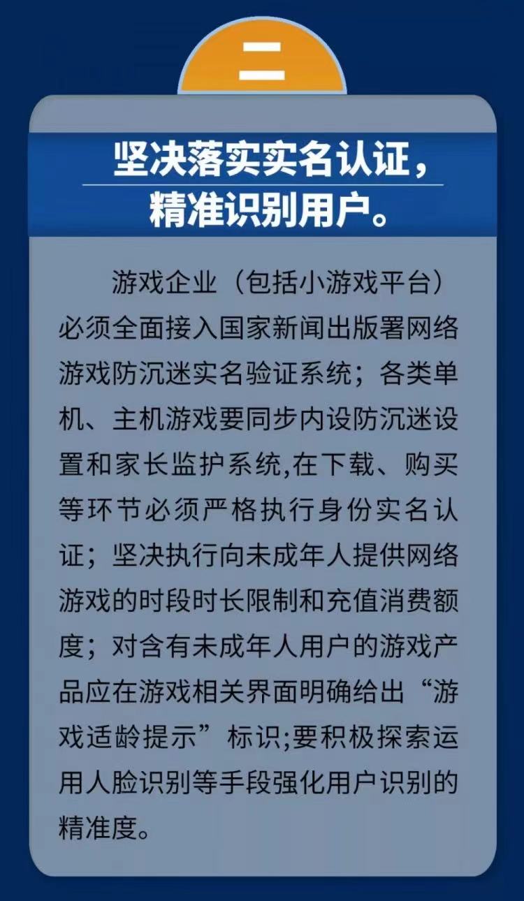2、堅(jiān)決落實(shí)實(shí)名認(rèn)證,精準(zhǔn)識別用戶。游戲企業(yè)(包括小游戲平臺)必須全面接入國家新聞出版署網(wǎng)絡(luò)游戲防沉迷實(shí)名驗(yàn)證系統(tǒng);各類單機(jī)、主機(jī)游戲要同步內(nèi)設(shè)防沉迷設(shè)置和家長監(jiān)護(hù)系統(tǒng),在下載、購買等環(huán)節(jié)必須嚴(yán)格執(zhí)行身份實(shí)名認(rèn)證;堅(jiān)決執(zhí)行向未成年人提供網(wǎng)絡(luò)游戲的時(shí)段時(shí)長限制和充值消費(fèi)額度;對含有未成年人用戶的游戲產(chǎn)品應(yīng)在游戲相關(guān)界面明確給出“游戲適齡提示”標(biāo)識;要積極探索運(yùn)用人臉識別等手段強(qiáng)化用戶識別的精準(zhǔn)度。