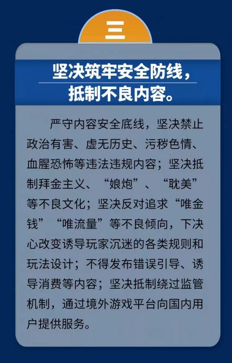 3、堅(jiān)決筑牢安全防線,抵制不良內(nèi)容。嚴(yán)守內(nèi)容安全底線,堅(jiān)決禁止政治有害、虛無歷史、污穢色情、血腥恐怖等違法違規(guī)內(nèi)容;堅(jiān)決抵制拜金主義、“娘炮”、“耽美”等不良文化;堅(jiān)決反對追求“唯金錢”“唯流量”等不良傾向,下決心改變誘導(dǎo)玩家沉迷的各類規(guī)則和玩法設(shè)計(jì);不得發(fā)布錯(cuò)誤引導(dǎo)、誘導(dǎo)消費(fèi)等內(nèi)容;堅(jiān)決抵制繞過監(jiān)管機(jī)制,通過境外游戲平臺向國內(nèi)用戶提供服務(wù)。