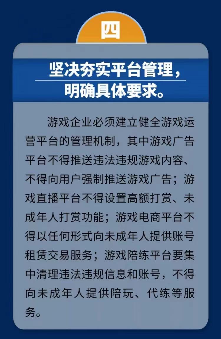 4、堅(jiān)決夯實(shí)平臺管理,明確具體要求。游戲企業(yè)必須建立健全游戲運(yùn)營平臺的管理機(jī)制,其中游戲廣告平臺不得推送違法違規(guī)游戲內(nèi)容、不得向用戶強(qiáng)制推送游戲廣告;游戲直播平臺不得設(shè)置高額打賞、未成年人打賞功能;游戲電商平臺不得以任何形式向未成年人提供賬號租賃交易服務(wù);游戲陪練平臺要集中清理違法違規(guī)信息和賬號,不得向未成年人提供陪玩、代練等服務(wù)。