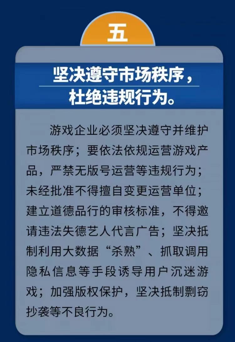 5、堅(jiān)決遵守市場秩序,杜絕違規(guī)行為。游戲企業(yè)必須堅(jiān)決遵守并維護(hù)市場秩序;要依法依規(guī)運(yùn)營游戲產(chǎn)品,嚴(yán)禁無版號運(yùn)營等違規(guī)行為;未經(jīng)批準(zhǔn)不得擅自變更運(yùn)營單位;建立道德品行的審核標(biāo)準(zhǔn),不得邀請違法失德藝人代言廣告;堅(jiān)決抵制利用大數(shù)據(jù)“殺熟”、抓取調(diào)用隱私信息等手段誘導(dǎo)用戶沉迷游戲;加強(qiáng)版權(quán)保護(hù),堅(jiān)決抵制剽竊抄襲等不良行為。