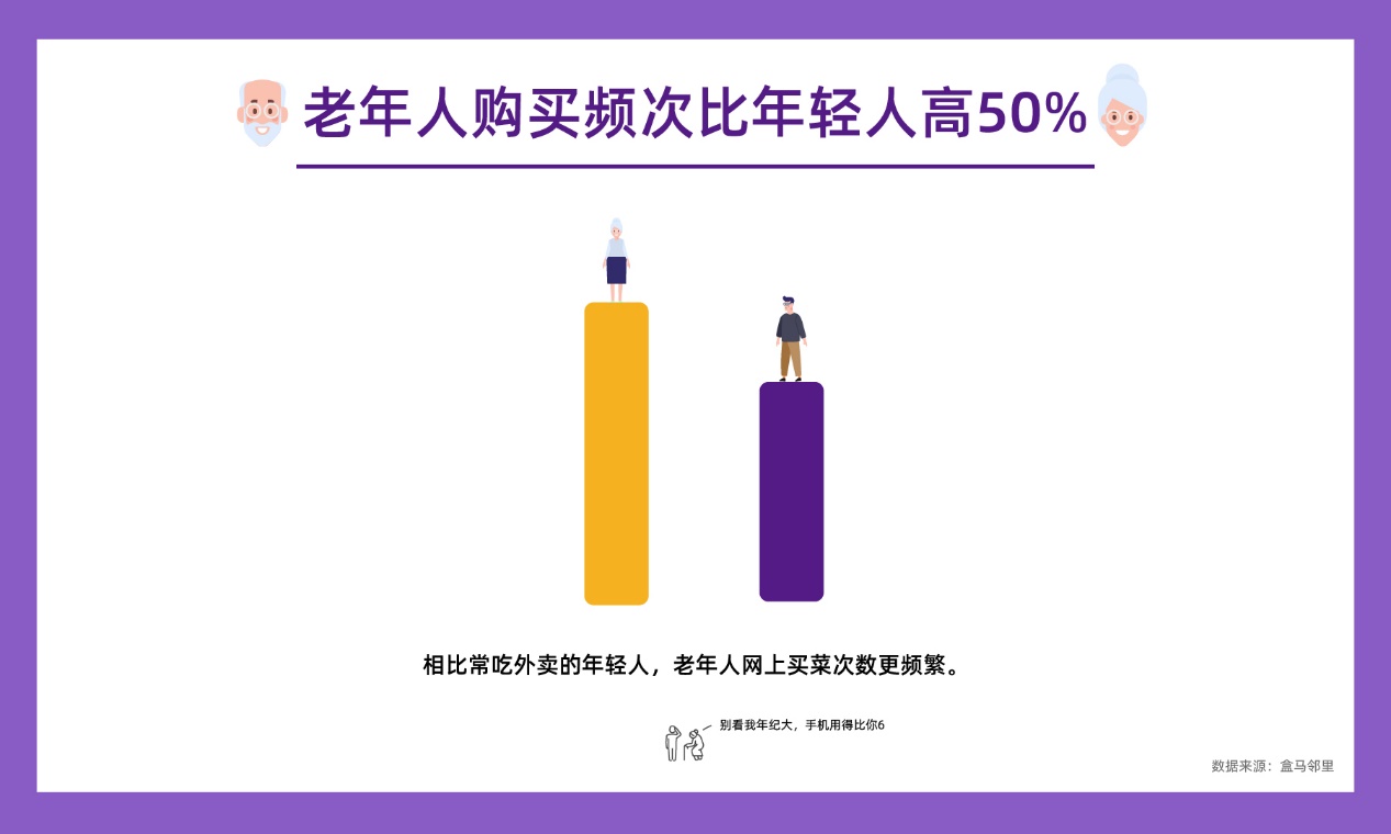 速途網10月14日消息(報道:李楠)現在,手機app不再是年輕人的專屬,越來越多老年人選擇在手機買菜。來自盒馬鄰里的數據顯示,消費者中,老年人占比達24%,且購買頻次比年輕人高出50%。