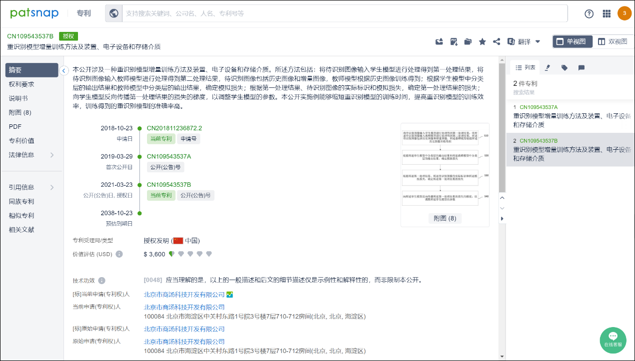 效率大幅提高在專利層面的對照,我們隨便抓取一件專利舉例,申請號為CN201811236872.2的“重識別模型增量訓練方法及裝置、電子設備和存儲介質”,其能夠縮短重識別模型的訓練時間,提高重識別模型的訓練效率,訓練得到的重識別模型的準確率高。