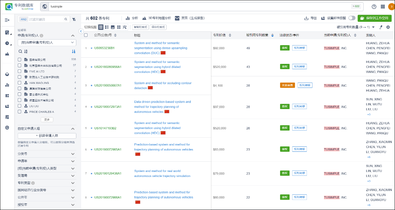 對比其他做智能汽車、做自動駕駛的公司。小馬智行,智慧芽上檢索到386件專利。Tusimple(自動駕駛貨運平臺),智慧芽上檢索到602件專利。