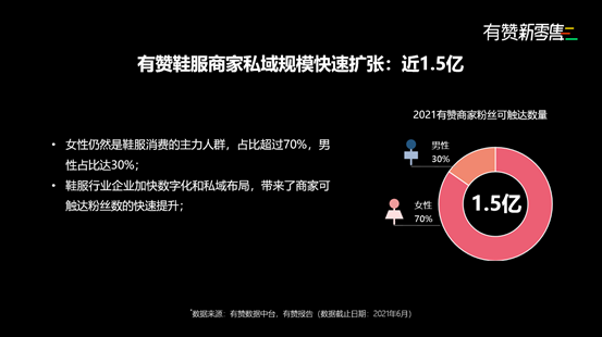 有贊數據顯示,過去一年中,有贊鞋服商家私域用戶的規模快速增長。截至 2021 年 6 月,有贊鞋服商家私域觸達的粉絲總量達到1.5億,包括奧康、紅蜻蜓、伊芙麗、都市麗人等鞋服行業頭部品牌進一步加快了在私域數字化方面的布局,且帶來了商家可觸達粉絲數的快速提升。