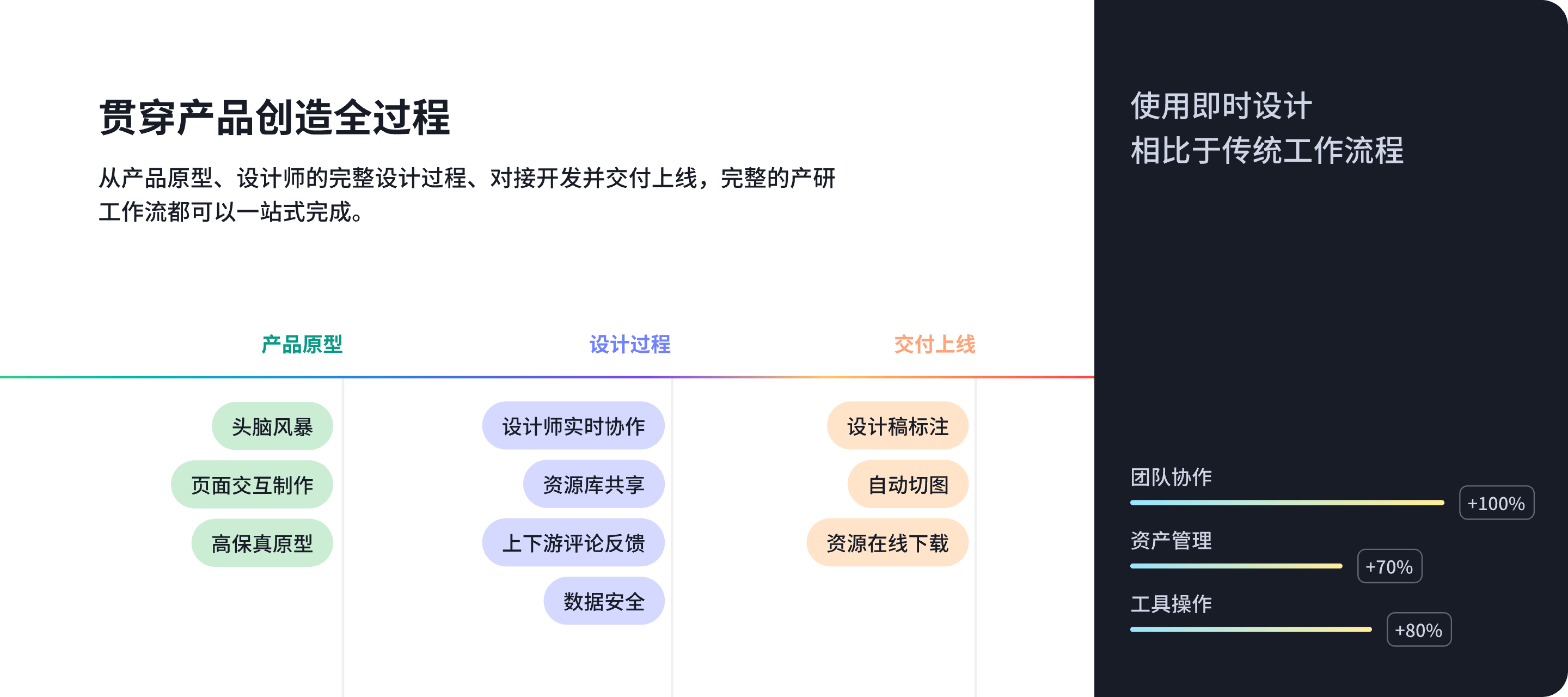 「即時設計」設計+協作的平臺形態已經成熟,設計師的設計創作、交互動效,產品經理的頁面跳轉梳理,同產研團隊的在線評審、打點討論,以及給開發交付的切圖導出、參數代碼標注等功能需求現在皆可通過即時設計一站式完成,并且實時協同。而且利用團隊文件狀態標簽、項目跟進和嵌套文件夾等獨特功能,配合在線工具云端存儲歷史版本的優勢,足以讓任何一個產研團隊最大程度地得到完善的數字資產管理和協同效率提升。