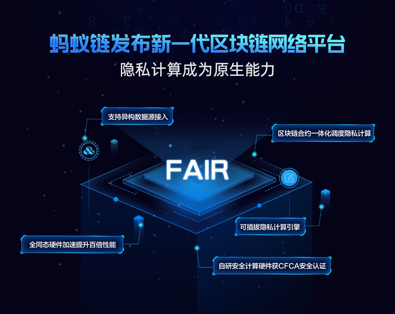 速途網10月22日訊(報道:喬志斌)今日,在2021杭州云棲大會上,螞蟻集團旗下螞蟻鏈宣布升級區塊鏈架構,在新架構上,隱私計算成為一種原生能力。螞蟻鏈還基于這一新架構推出全新區塊鏈網絡平臺「FAIR」,在「FAIR」上,隱私計算將在出廠設置中就與區塊鏈一起融合到單個系統內。