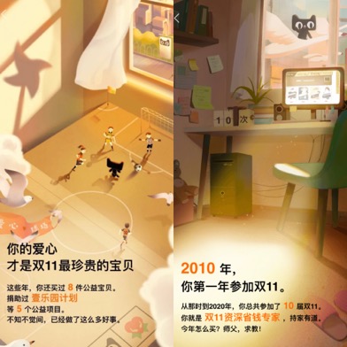 速途網(wǎng)獲悉,這是天貓雙11首次發(fā)布購物車回憶錄。相比于其他賬單型H5,這份回憶錄弱化了下單金額,更聚焦在引發(fā)消費者回憶的雙十一點滴,包括參加幾屆雙11、下單最貴寶貝的時間、寶貝曾被寄往哪些城市,以及參與公益寶貝概況等。
