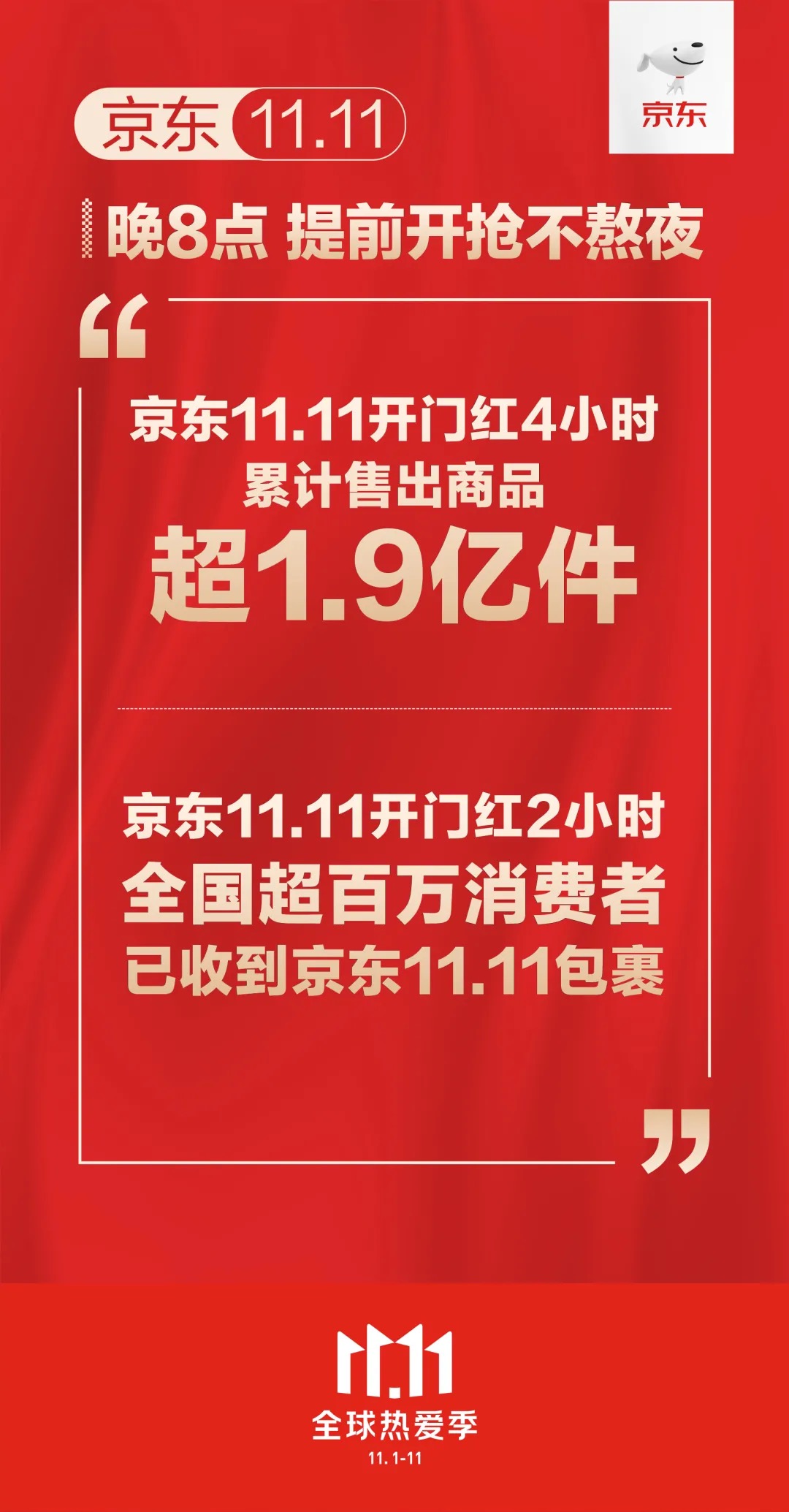 速途網11月1日訊(報道:喬志斌)10月31日晚8點,2021年京東11.11全球熱愛季正式開啟,開始的4個小時內,京東累計售出商品超1.9億件;而截至31日22點的兩小時內,全國超百萬消費者已經收到京東11.11包裹。