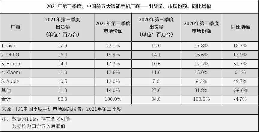 根據IDC公布的國內手機市場跟蹤報告,2021年第一、第二季度,vivo手機(含iQOO品牌)出貨量市場份額分別為23.0%和23.8%,位列第一。第三季度,vivo手機出貨量1790萬臺,同比增長18.7%,以22.1%的市場占有率再次位列第一。