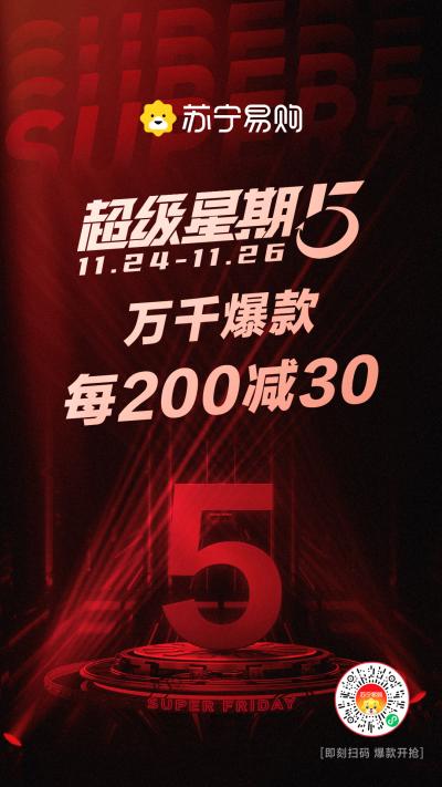 本次超級星期五分為20日至23日的預購期,和24日至26日的全面爆發期。大促期間蘇寧易購攜手超級品牌,以超級力度開展多種滿減、免息、折扣活動。家電產品每1000減100,非家電產品每200減30,此外還有蘇寧易購品牌回饋直播,SUPER會員專享優惠,云鉆抵現金等活動,年度感恩回饋消費者。