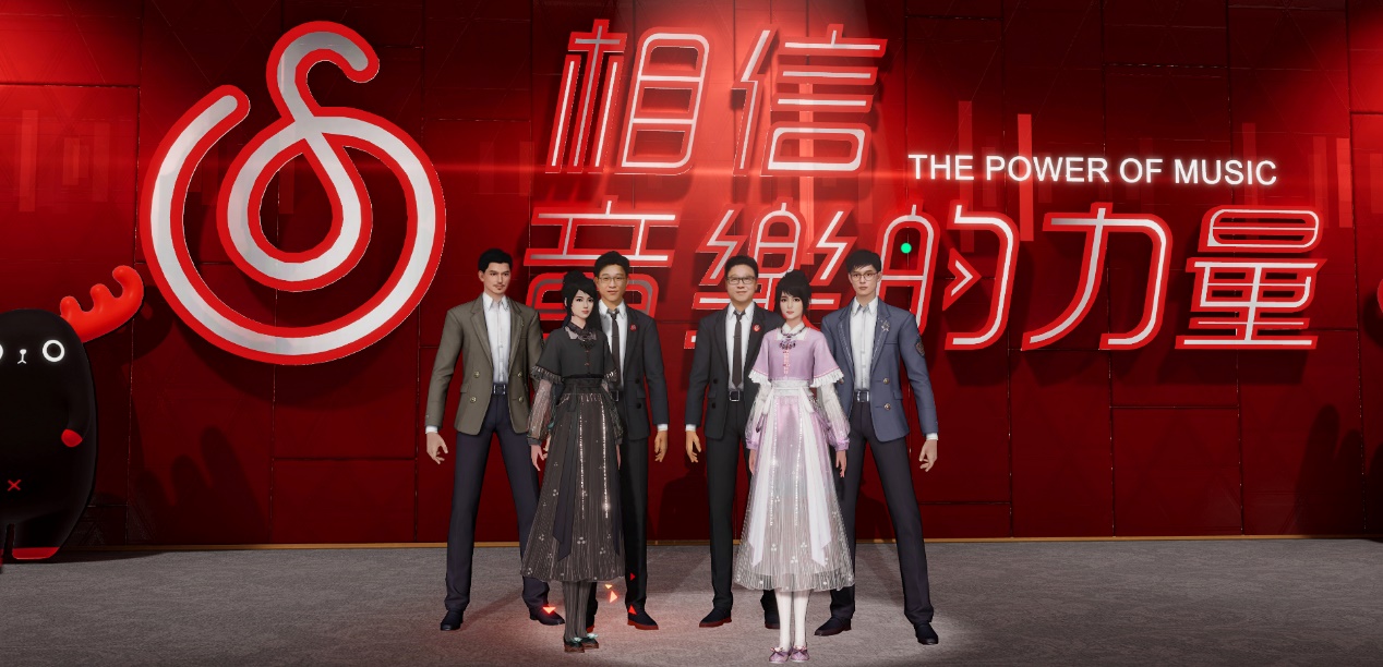 除了三個“丁磊”同時敲鑼外,整個會場的布置也隨處體現音樂熱愛者的元素,不僅座位是愛心的形狀,還有后排是“相信音樂的力量”的閃爍燈牌,舞臺上是轉動的黑膠唱片。更有意思的是,參與觀禮的嘉賓可以操控自己的“數字分身”,與AI虛擬人“丁磊”一起完成交流、合影、跳舞等等互動。