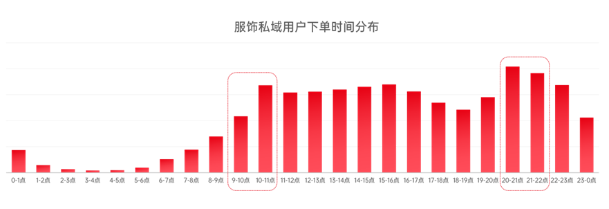 而從消費(fèi)行為看,服飾私域用戶上午10點(diǎn)左右和晚上8點(diǎn)以后下單會出現(xiàn)小高峰,這和服飾品上新、促銷活動節(jié)奏基本保持一致。而在品牌門店打烊時間(晚上22:00-第2天早上9點(diǎn)),私域經(jīng)營正在為服飾品牌帶來更多“睡后收入”。