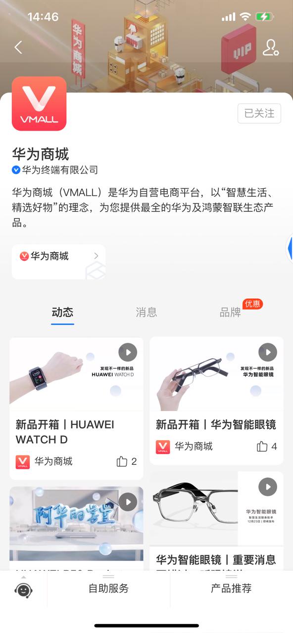 以華為商城為例,在生活號里,用戶可以看到華為商城近期發布的動態、專欄消息;能通過“自助服務”使用相關服務,還能直接跳轉商家小程序,進行下單購買或其他后續操作。除了直接在“生活頻道”里刷到相關信息,用戶還可在支付寶App首頁搜索“華為”,從搜索結果頁進入華為商城的生活號。