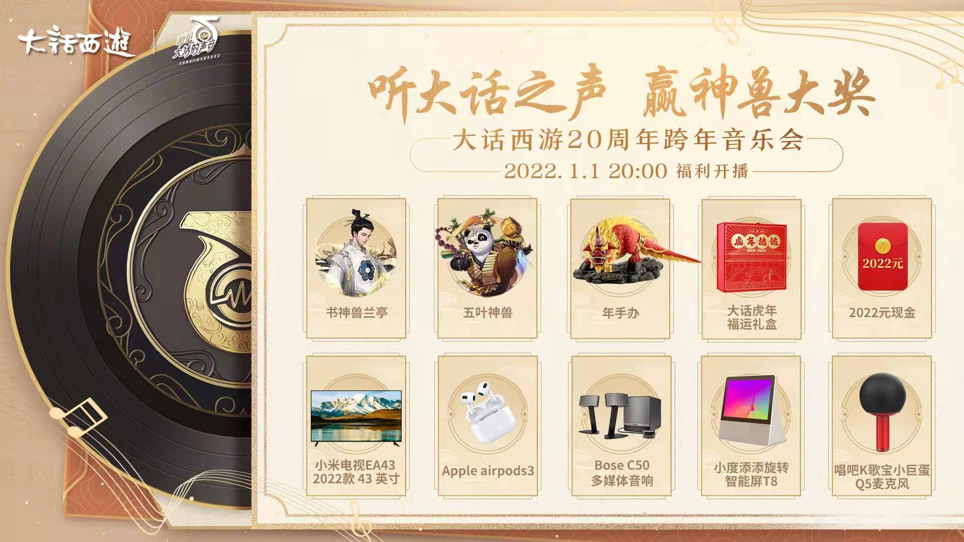 鎖定直播,參與官方CC直播間互動,大話將為兄弟們送上豪華“聲音”禮包。Bose C50多媒體音箱、AirPods3、小度添添、唱吧K歌寶、網易云音樂黑膠會員年卡,帶給你多樣化聲音享受。參與官方CC直播間或《大話西游》手游內音樂會活動還能領取游戲內神獸、小米電視、珍稀年手辦、現金紅包2022等驚喜福利!