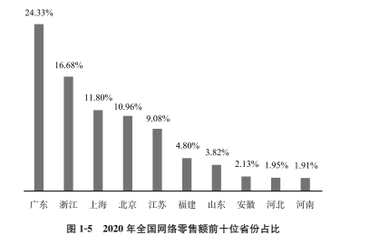 國家統(tǒng)計局《中國電子商務報告(2020)》顯示,2020年全國電子商務交易額達37.21萬億元,同比增長4.5%,其中全國網絡零售額達11.76萬億元,同比增長10.9%。從各省份的數(shù)據(jù)來看,廣東、浙江、上海、北京和江蘇是網絡零售額占比排名的前五位。其中廣東占2020年全國網絡零售額的24.33%,比第二名的浙江高出7.65個百分點,増勢迅猛。