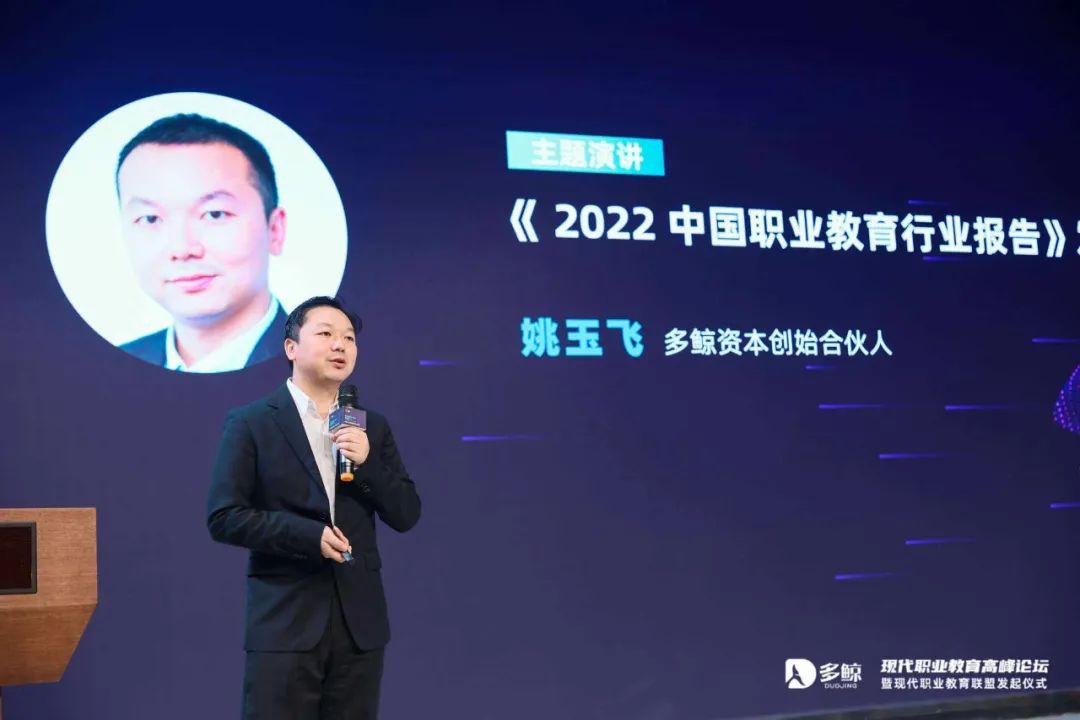 活動開場,多鯨資本創始合伙人姚玉飛上臺致辭,并分享《2022 中國職業教育行業報告》,拉開現代職業教育高峰論壇的序幕。