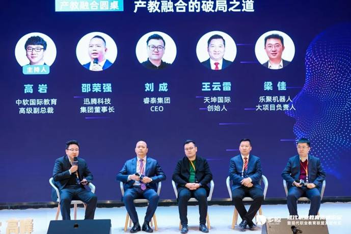 上市公司圓桌之后,是產教融合圓桌討論。在中軟國際教育高級副總裁高巖的主持下,迅騰科技集團董事長邵榮強、睿泰集團 CEO 劉成、天坤國際創始人王云雷、樂聚機器人大項目負責人梁佳,以《產教融合的破局之道》為主題,探討產教融合的新思路和新方法。