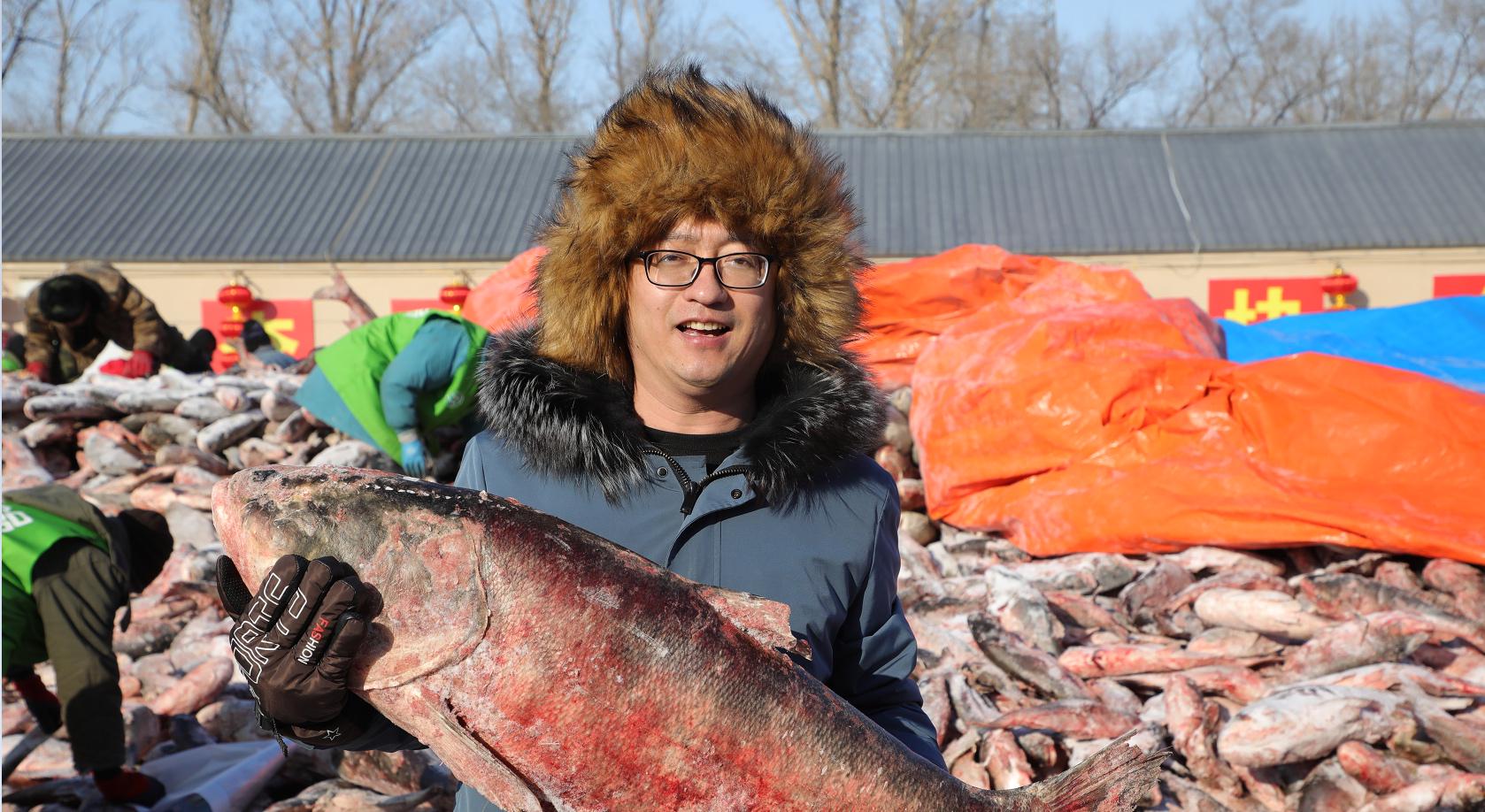 趙明明抱著一尾剛剛新鮮捕撈上來的查干湖胖頭魚