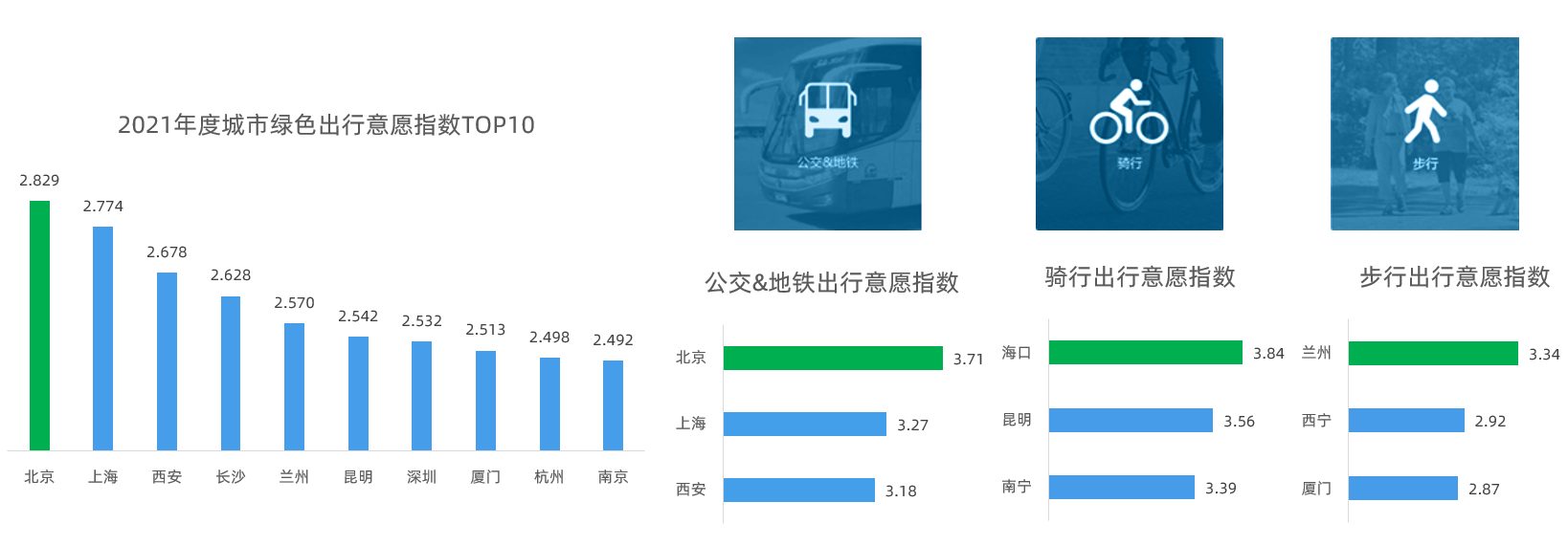 從各類綠色出行方式來看,公交&地鐵、騎行、步行出行意愿排名第一的城市分別為北京、海口、蘭州,與上一年度排名一致。