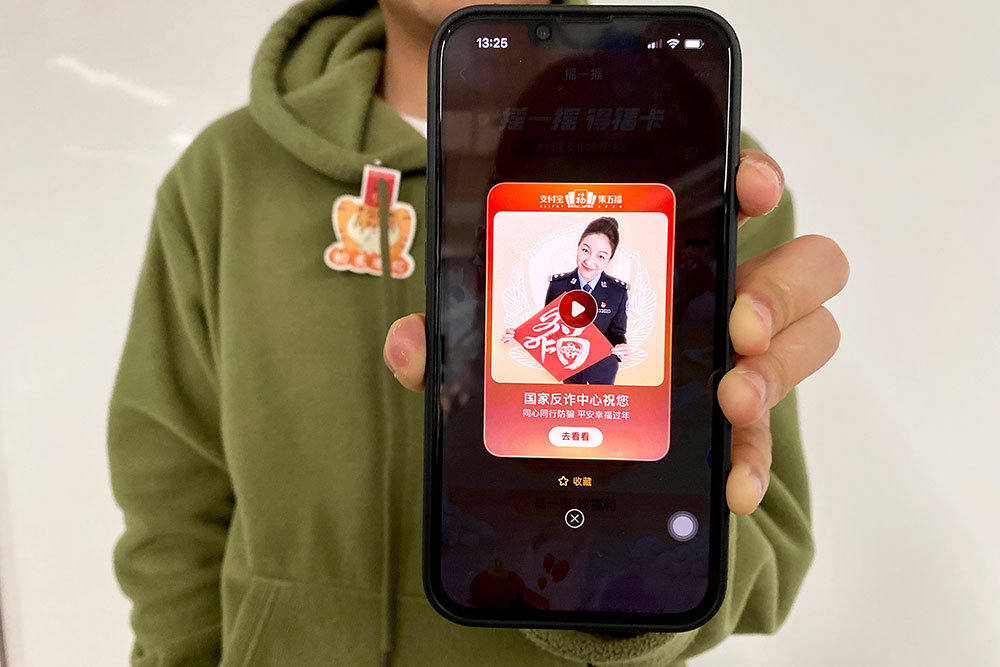 近日,支付寶五?;顒诱介_啟。記者發現,大家掃到的一張張??ㄖ羞€出現了國家反詐中心以及各地反詐民警的身影,他們在新春期間也成為“送福人”,為老百姓送上新年問候和反詐提醒。