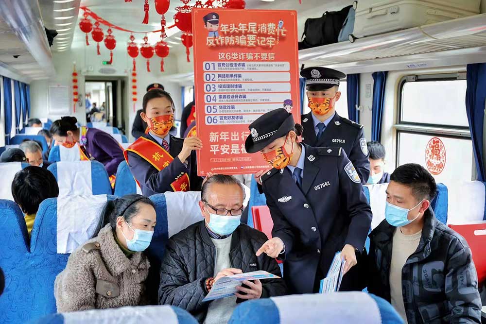 此外,中國鐵路上海局集團有限公司杭州客運段、杭州鐵路公安處乘警支隊共同在杭州東至蒼南G7467次、廣州至寧波K210次列車上開設了“反詐列車”主題車廂,并準備了防詐新春大禮包給返鄉旅客,做好春運期間的反詐防騙宣傳。