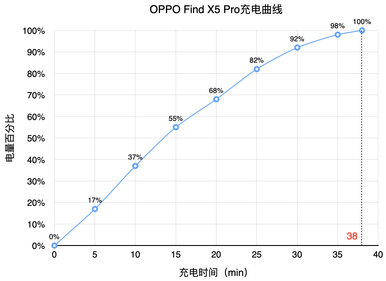 續(xù)航方面,F(xiàn)ind X5 Pro內(nèi)置了5000mAh的雙電芯大容量電池,并升級(jí)到了最高80W的SuperVOOC有線閃充,此外還搭配最高50W的AirVOOC無(wú)線充電技術(shù)。實(shí)測(cè)使用原裝充電器材為Find X5 Pro進(jìn)行有線充電,0-100%充電僅需耗時(shí)38分鐘。