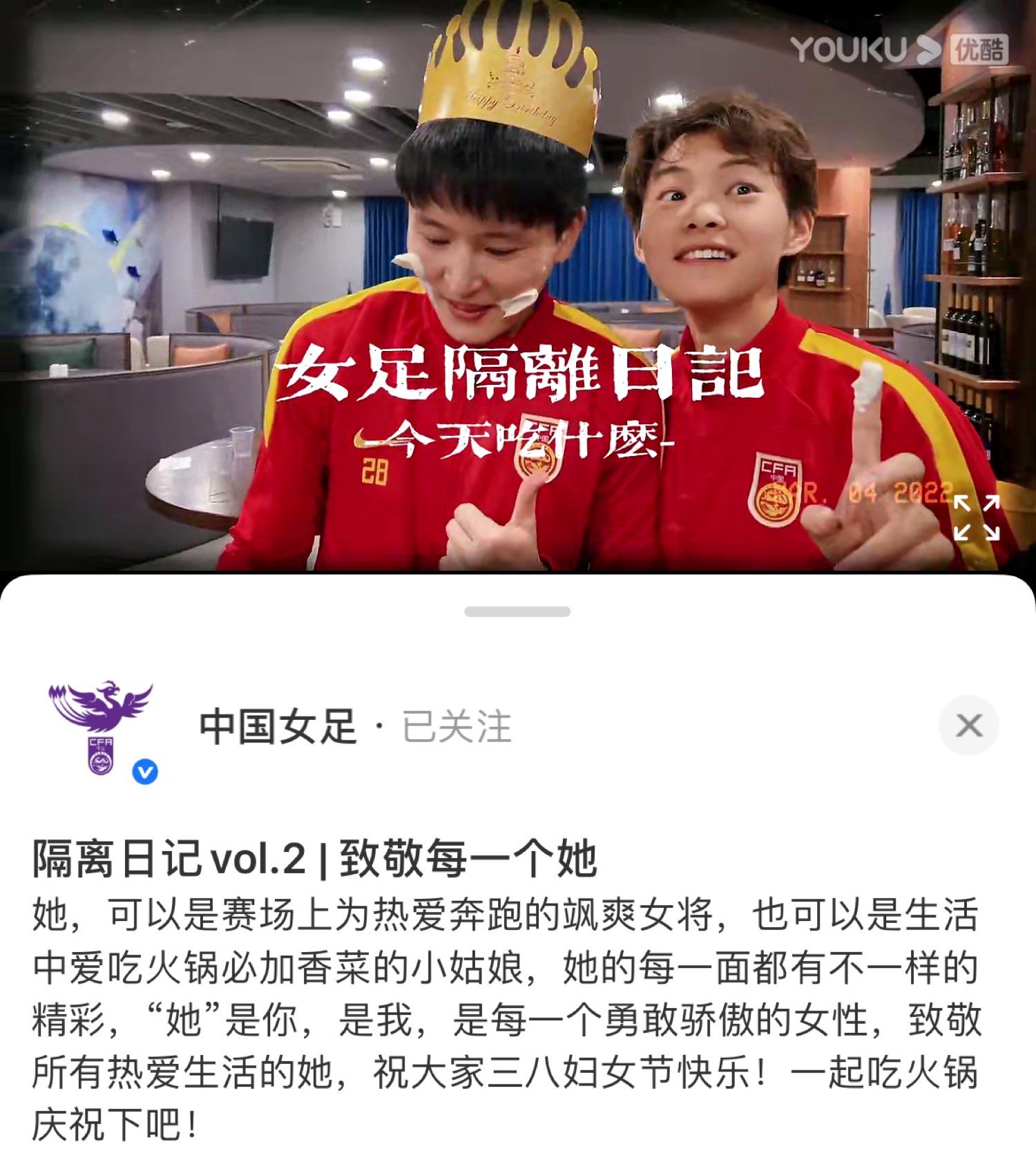 中國女足官方生活號發布女足隔離vlog系列視頻