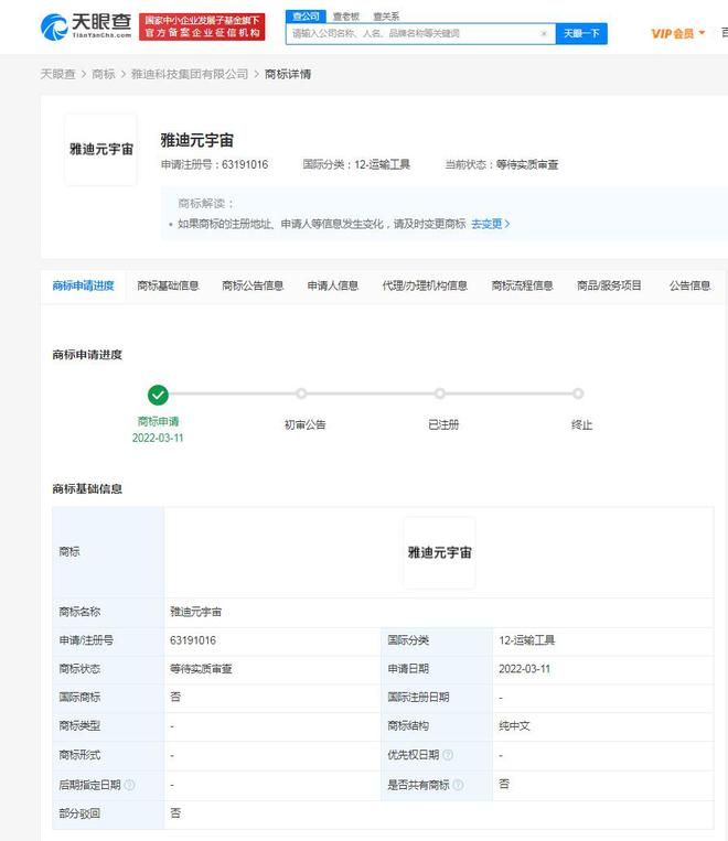 雅迪電動車申請元宇宙商標 速途研究院 ? 2022年3月28日 16:22 ? 元宇宙 速途元宇宙研究院3月28日訊 天眼查App顯示,近日,雅迪科技集團有限公司申請注冊“ 雅迪元宇宙”“小迪元宇宙”“換電獸元宇宙”“VFLY 元宇宙”“TTFAR 元宇宙”等商標,國際分類包括運輸工具、廣告銷售等,當前商標狀態為等待實質審查。 雅迪 贊 (0) 速途研究院 0 生成海報 丁香學堂線下沙龍走入江城,幫醫生放大專業知識價值 上一篇 2022年3月28日 15:53 螞蟻集團推出可信密態計算技術,可支撐隱私計算落地大規模數據場景 下一篇 2022年3月28日 17:29