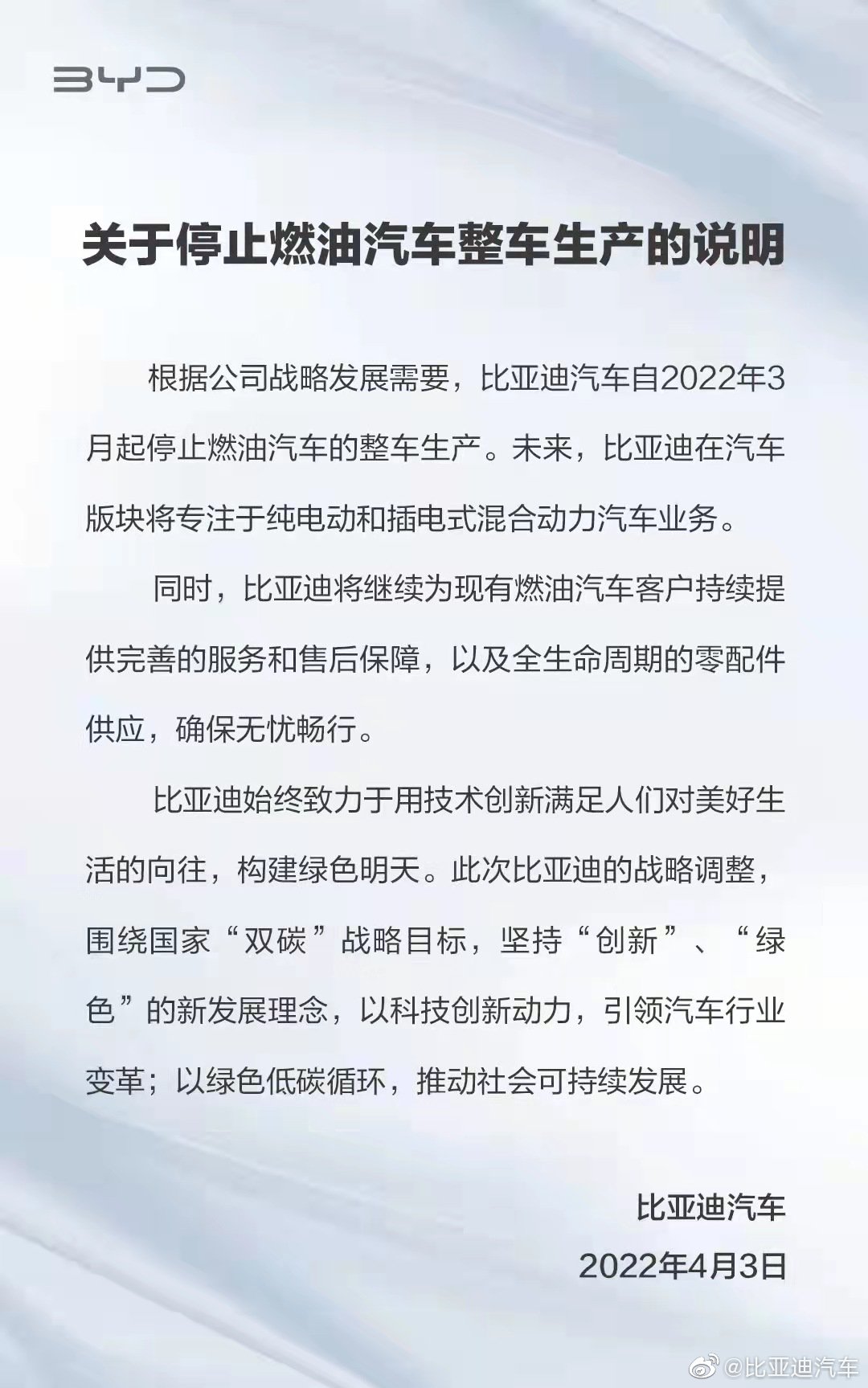 速途網4月3日消息(報道:李楠)今日,比亞迪發布公告稱,根據戰略發展需要,公司自2022年3月起停止燃油汽車的整車生產。