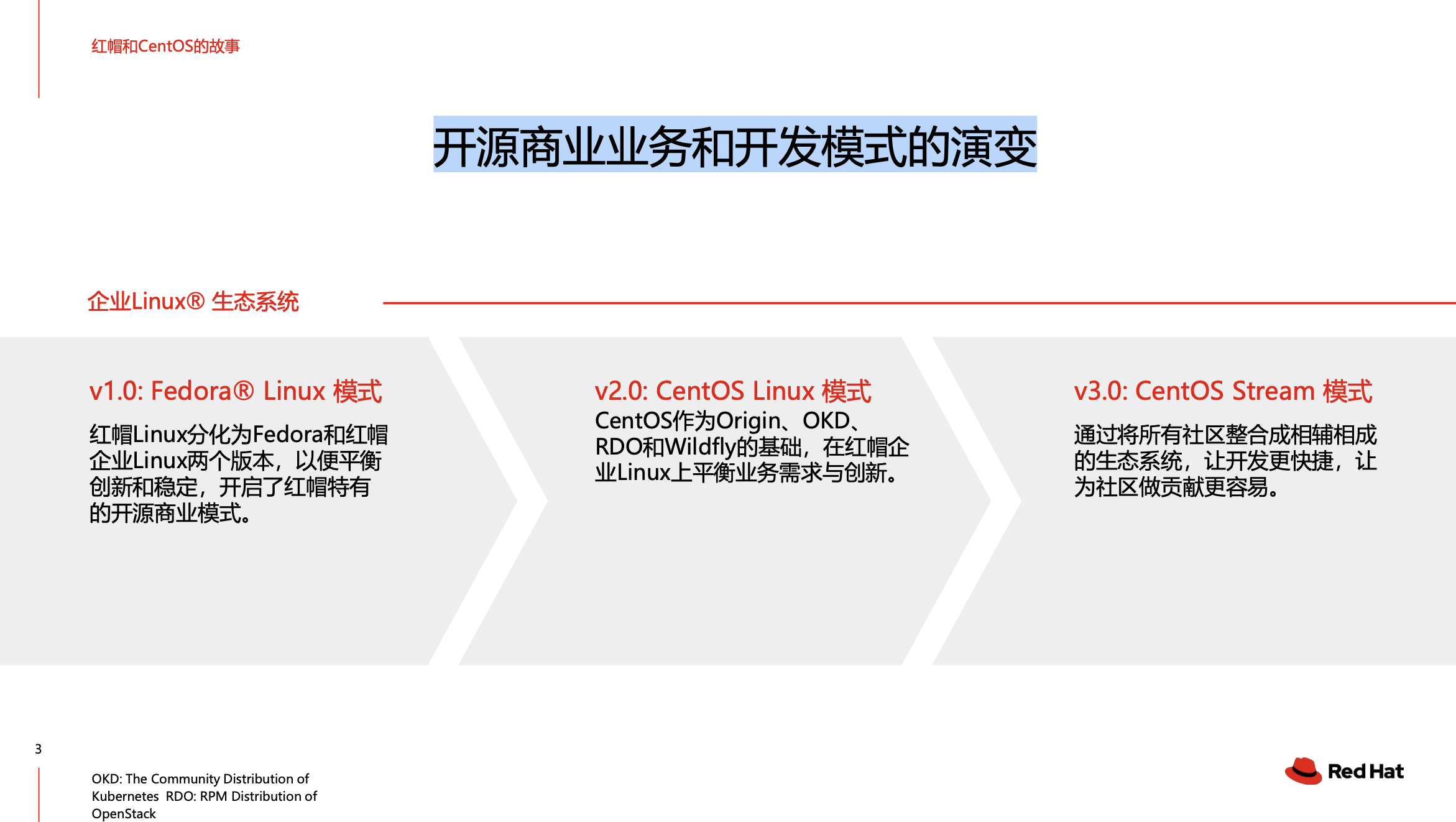 曹衡康指出,紅帽開源商業業務和開發模式的演變,共分為三個階段。其中v1.0階段為Fedora Linux模式,這一階段紅帽Linux分化為Fedora和紅帽企業Linux兩個版本,以便平衡創新和穩定,開啟了紅帽特有的開源商業模式。v2.0階段的代表,則是紅帽推出了CentOS Linux模式,CentOS作為Origin、OKD、RDO和Wildfly的基礎,在紅帽企業Linux上平衡了業務需求與創新。CentOS Linux是紅帽在企業級RHEL版本當中所衍生出來的社區版本。