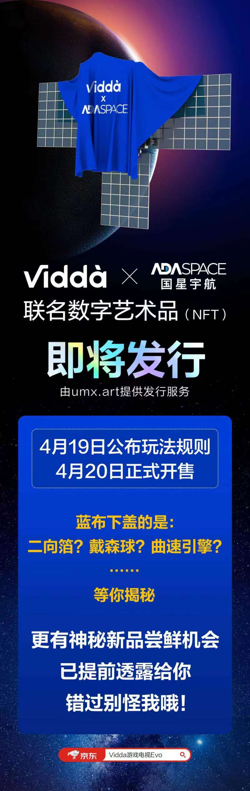 速途元宇宙研究院4月15日訊 今日,海信旗下年輕潮牌Vidda今天通過官方微博宣布即將推出聯名NFT(數字藝術品)。根據海報信息,該NFT將于19日公布詳細的玩法規則,20日正式發售。同時,海報中透露的神秘新品也被網友猜測為傳言中的Vidda智能激光投影新品。