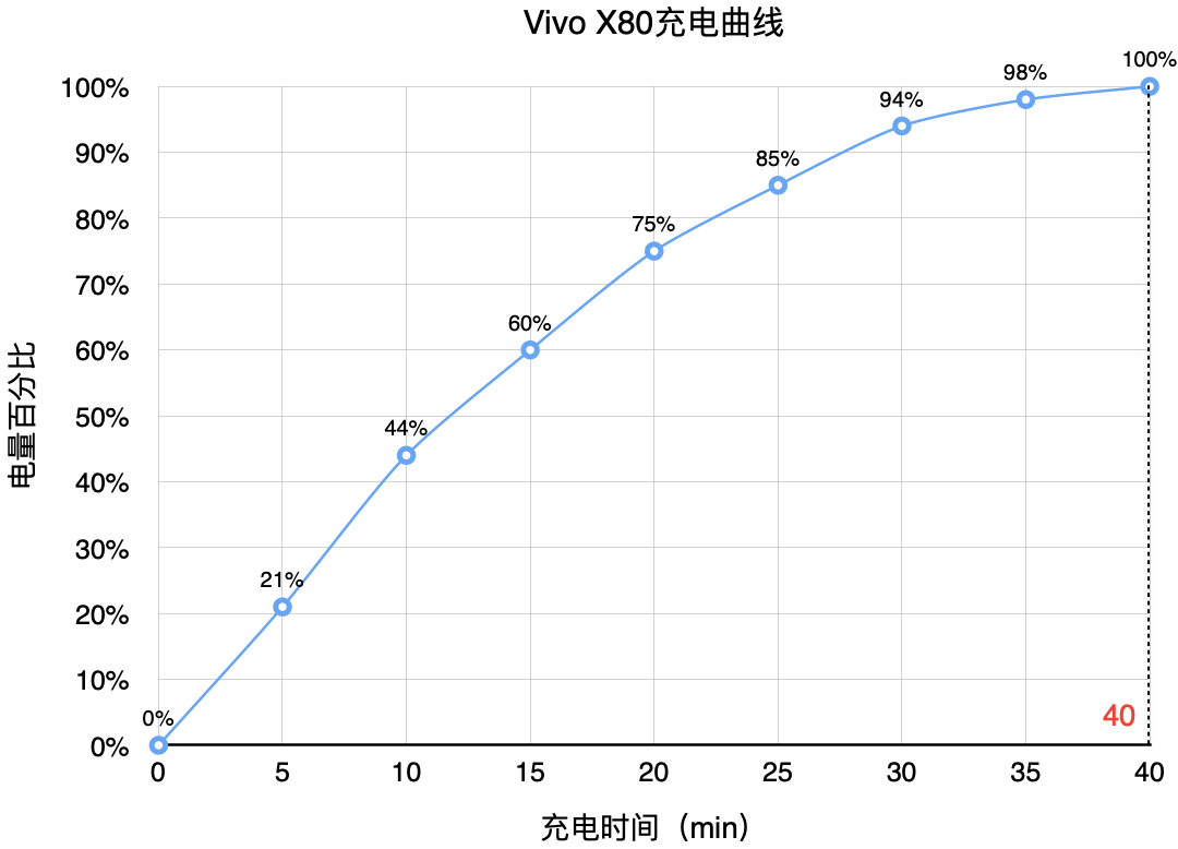 實(shí)測使用原裝充電器為手機(jī)充電,前15分鐘即可為手機(jī)充電60%,0-100%共耗時40分鐘。