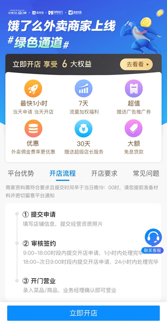 為應對可能激增的商家上線需求,餓了么還在北京開通了餐飲商家上線綠色通道,符合資質的商家最快可以在1小時完成線上及人工審核。
