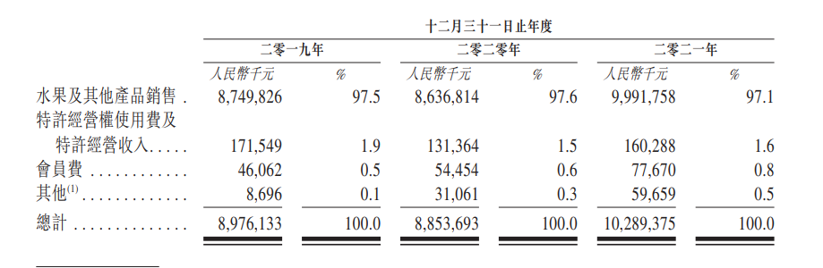 從收入類型來看,水果及其他產品銷售為百果園的核心收入來源,該部分收入在2021年占比達到了97.1%,對于該部分收入2021年相比于2020年增長,百果園稱這是由于凈增加了362家自行管理的加盟門店以及線下零售門店銷售額的復蘇所推動。但會員費收入自2019年逐年增長,2021年該部分收入為7767萬元。