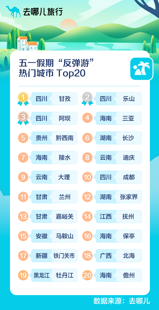 從整體上看,四川、海南、云南、湖南地區“反彈游”漲幅較高,在五一假期“反彈游”熱門城市中,旅游資源豐富,并極具民族特色的四川、海南、云南、湖南成為此次五一旅游最熱區域。