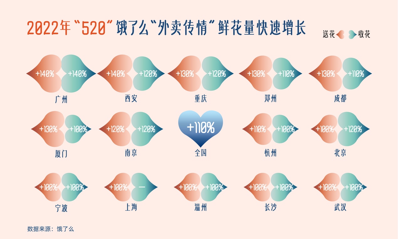 從增幅來看,廣州和西安消費(fèi)者“外賣傳情”表達(dá)愛的需求增長較為顯著,餓了么鮮花外賣訂單量年均增長均為1.4倍。