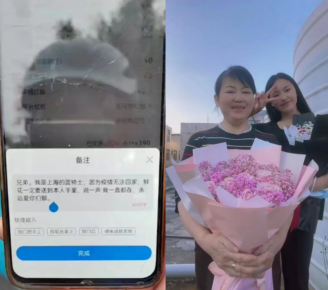 “520”不單是情侶、夫妻之間表達(dá)愛的契機(jī),不少漂泊在外的年輕人也會(huì)選擇在這個(gè)節(jié)日向父母表達(dá)思念和愛。“兄弟,我是上海藍(lán)騎士,好久沒回家了,花一定要送到本人手里,說一聲,我一直都在,永遠(yuǎn)愛你們”,96年的餓了么騎手阿文在上海青浦徐涇跑單已經(jīng)3年,他跟遠(yuǎn)在昆明打工的妻子、母親已經(jīng)超過一年多沒見面,所以他決定在“520”給遠(yuǎn)方的妻子和母親送去鮮花,“她倆雖然在鮮花之城,卻從來沒收到過花,我也挺不好意思的”。