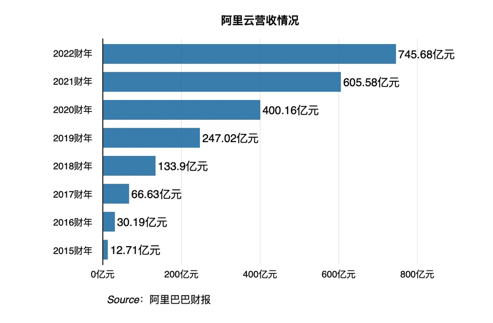 數據顯示,以抵銷跨分部交易后口徑計算(扣除來自為其他阿里巴巴業務提供服務的收入),阿里云營收規模從2015財年的12.71億,增長到2022財年(2021年4月到2022年3月底)的745.68億,8年增長57倍。在用戶規模上,阿里云付費客戶數量超過400萬,其中包括62%的A股上市公司。