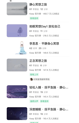 截至目前,Keep已圍繞冥想領域推出多套課程,并不斷進行內容上的深化挖掘。一方面,Keep以專業的態度探索課程內容的多樣性,比如不斷推出以熬夜速睡、深度睡眠緩解焦慮、頌缽療愈等為代表的垂直小眾類別課;另一方面Keep也攜手跨界伙伴們探索課程內容的新穎性,聯合打造了《白敬亭?晚安冥想》《李思思?平靜身心冥想》等代表性課程。