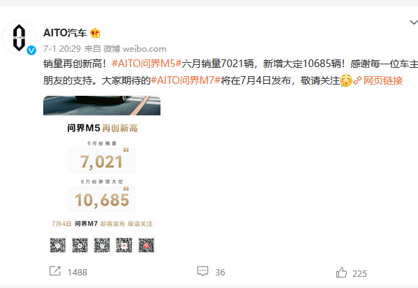 值得注意的是,這是華為與重慶車企小康股份共同打造的電動車品牌AITO的第二款產(chǎn)品。此時距離上一款車問界M5上市交付僅四個月,且該車型仍在華為發(fā)布會上發(fā)布。