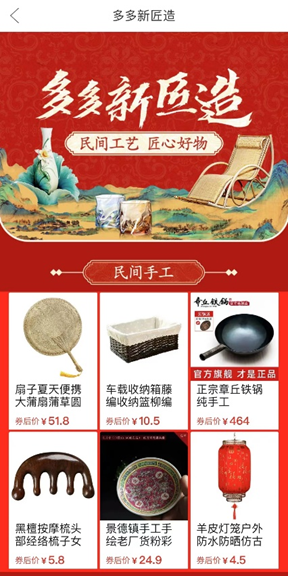 據(jù)了解,“多多新匠造”首期活動(dòng)將從8月份初持續(xù)到10月份底,期間,“百億補(bǔ)貼”頻道也將對(duì)入圍的手工產(chǎn)品進(jìn)行重點(diǎn)傾斜。