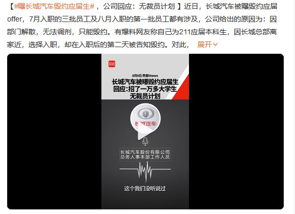 事實上,此前已經有多家車企被爆出毀約“校招應屆生”的事件。