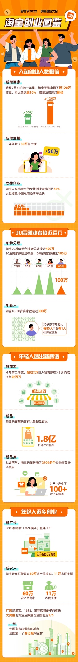 今年,線上線下共計28萬商家報名參加了造物節活動,是歷年多最多的一次。與之對應,“入淘”創業人數呈現持續增長態勢。數據顯示,截至7月31日過去一年里,淘寶天貓凈增了近120萬商家,增量與增速均翻了一倍多。